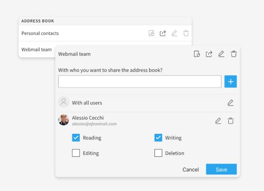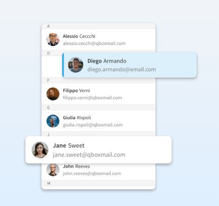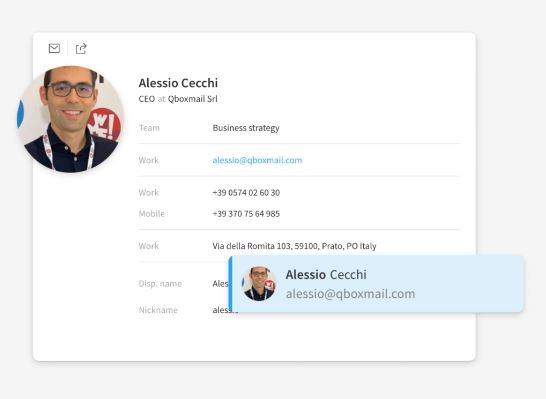 Grazie alla sincronizzazione dei sistemi di gestione ed API di Qboxmail ogni volta che l’account di un nuovo utente viene aggiunto al dominio aziendale, i suoi dati di contatto vengono immediatamente resi disponibili per tutti i membri dell’azienda, semplificando e facilitando così lo scambio di informazioni in azienda.